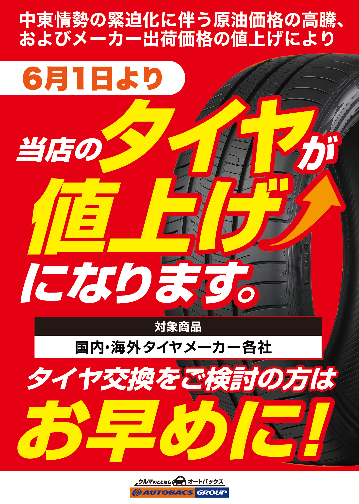 現在、タイヤの購入や交換をご検討中のお客様は、値上げ前の今が最もお得なタイミングです。